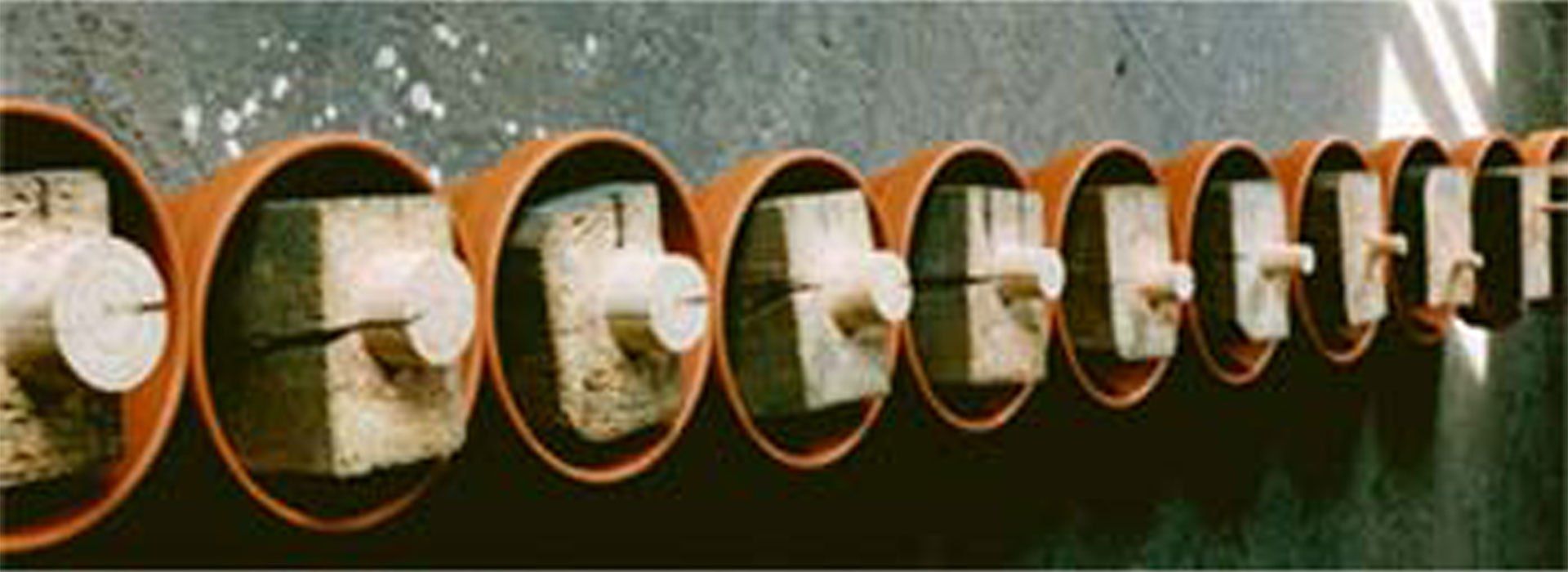 "Wood Row" (ger. "Holzreihe"), 1999. Wooden sculpture (wooden beams and flower pots). This sculpture, like the "Color Row" by Sebastian Bieniek, was destroyed in 2003 and therefore only exists in photos.
