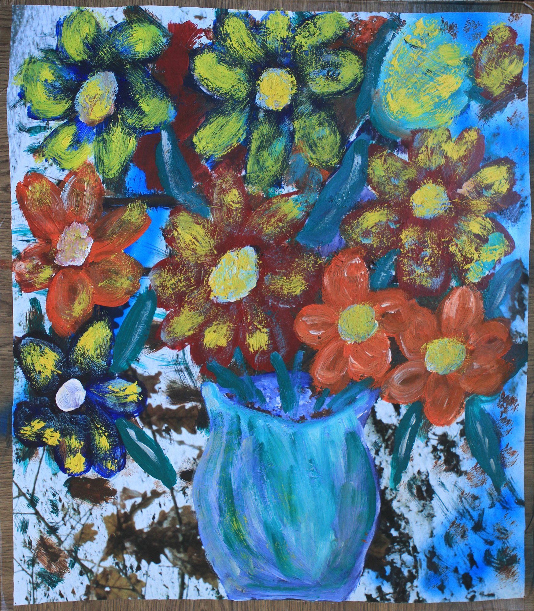 During a visit in 2012, Sebastian Bieniek discovers that his mother has recently started painting. She paints flowers. The son first praises her. Praises that she paints at all and tries something new, then he takes a closer look at the painted flowers, asks about the color, the base, touches the base, turns it over and realizes that the base is nothing more than his own photos. His mother had cut the large-format one-offs of his photos, which he had stored at her place, into small pieces and painted flowers on them. At first there are discussions and accusations, but then the son decides to turn the game around again and to make his work of art, which has become his mother's work, his own work again. He calls it "Overpainted Sebastian Bieniek".