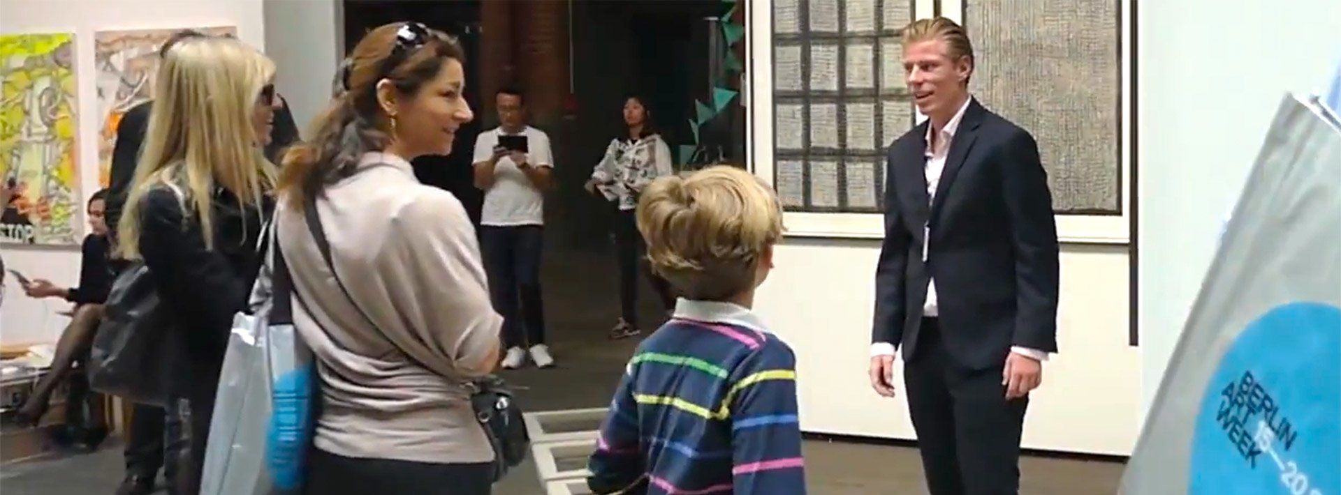 "Stealing blue Shoes" performance at the ABC Art Berlin Contemporary art fair 2015 by Sebastian Bieniek. The artist is stealing the shoes of an galleryist at the fair. This is probably something that should have been done for a long time.
