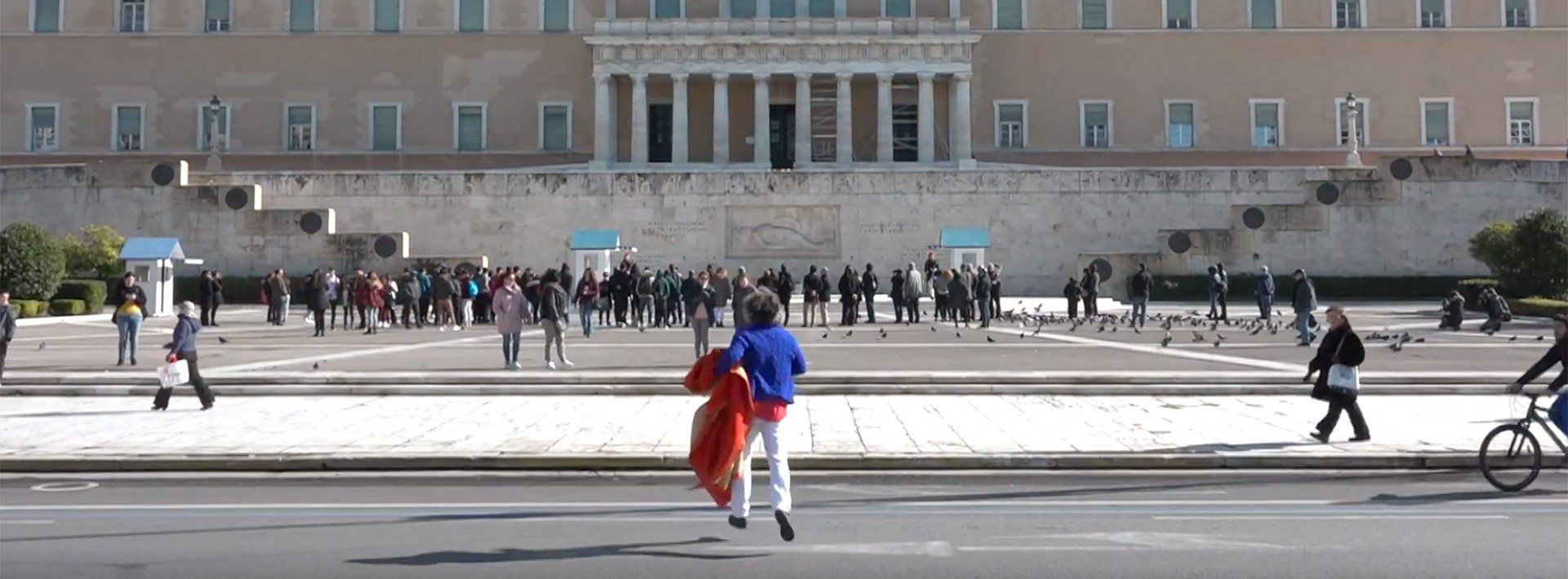 "The Climax of Modern Democracy" performance by Sebastian Bieniek, Hellenic Parliament, Syntagma Square, Athens, Greece, 2018. The artist layed down on the sidewalk directly in front of the Greek parliament and covered himself completely with a blanket. Through the ceiling you could see him making movements that were reminiscent of sexual intercourse.