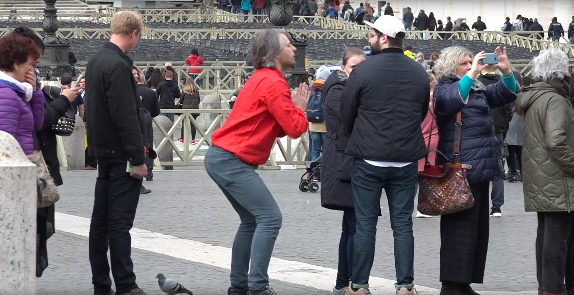"Santa, Santa", Performance art by Sebastian Bieniek (B1EN1EK), 2017 St. Peter's Square, Vatican City. The artist makes praying and sexual movements at the same time which are opposites while one is holy and the other not.