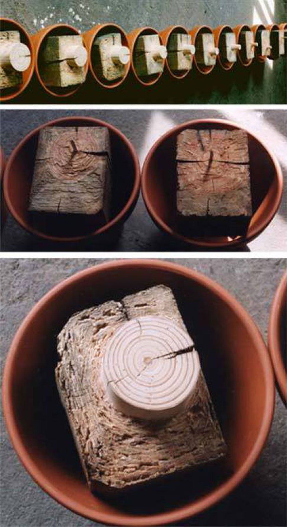 "Wood Row" (ger. "Holzreihe"), 1999. Wooden sculpture (wooden beams and flower pots). This sculpture, like the "Color Row" by Sebastian Bieniek, was destroyed in 2003 and therefore only exists in photos.