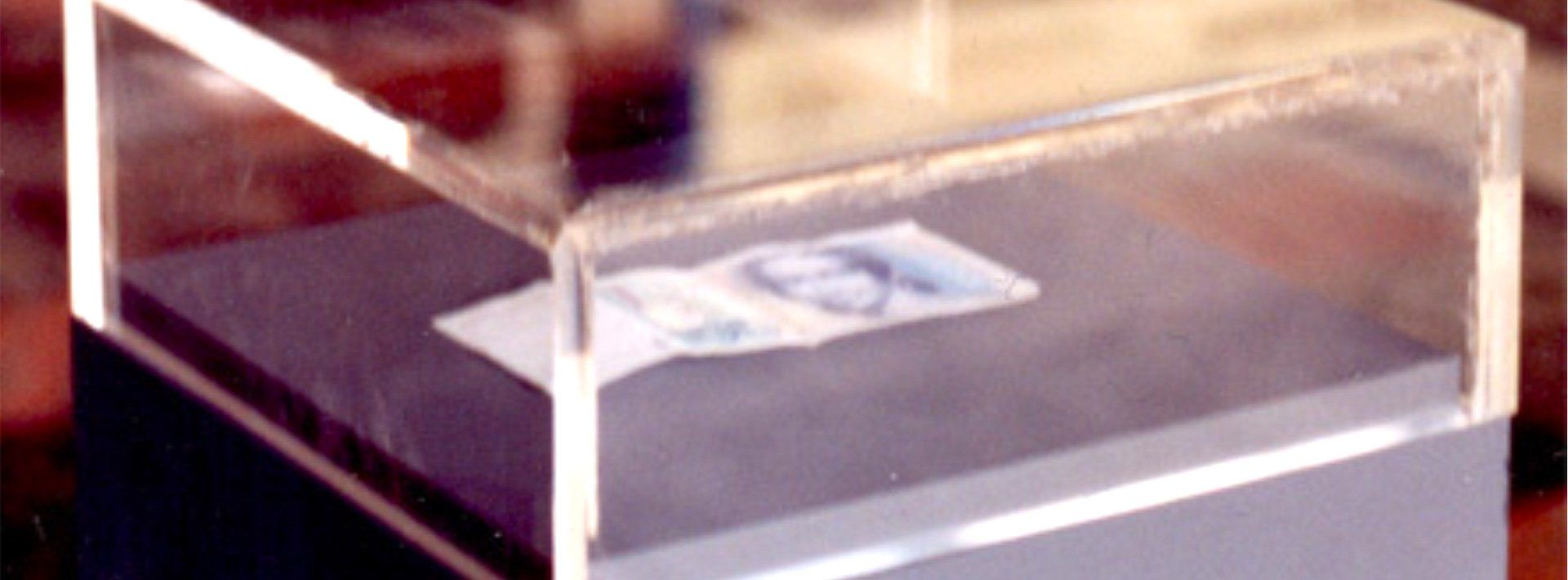 Sebastian Bieniek built a showcase for the "Transfer" exhibition at the Braunschweig train station. He put a 100 DM note in this showcase. The plexiglass hood on the showcase was not fastened. After a few hours the 100 DM note has disappeared and a sign that was underneath appeared. The sign read: "Die stolen 100 DM, Sebastian Bieniek 2000" which was from the beginning as the title of the artwork planned.