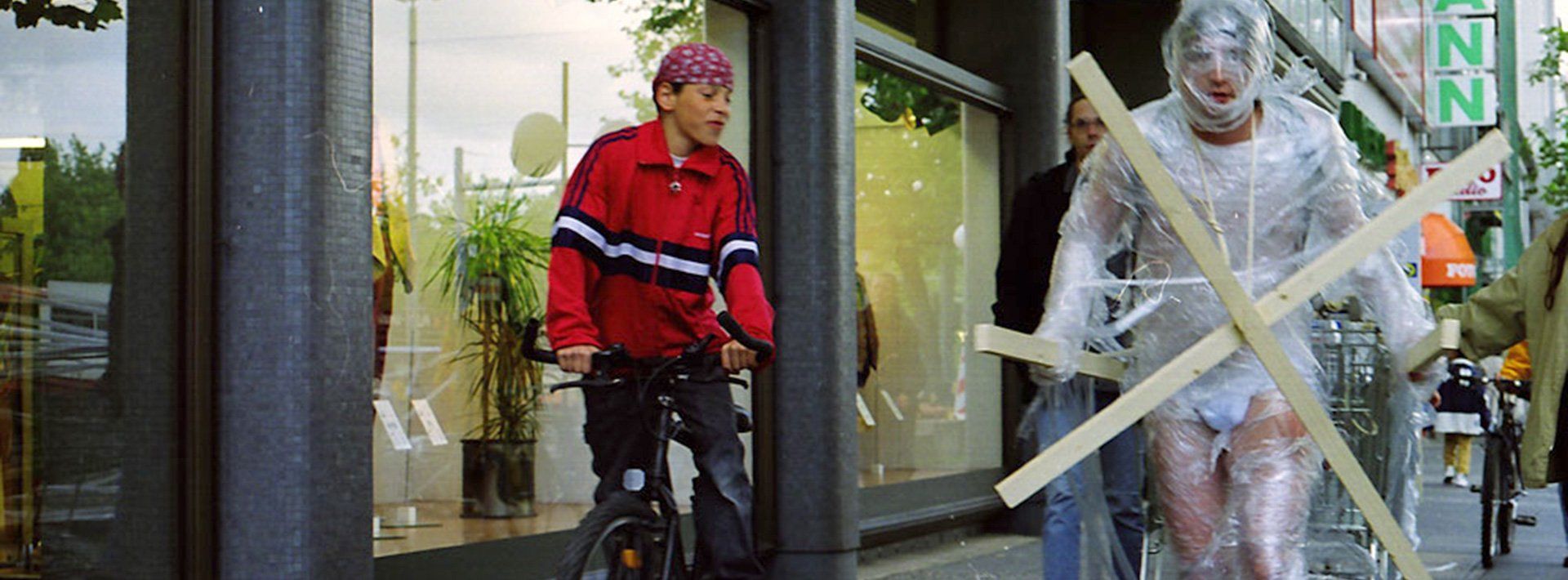 "Sponsored By", a performance in the city center of Braunschweig with seven shopping carts with advertising lettering and a cross hanging around them. It was only one month after Bieniek started to study art in the city of Braunschweig.