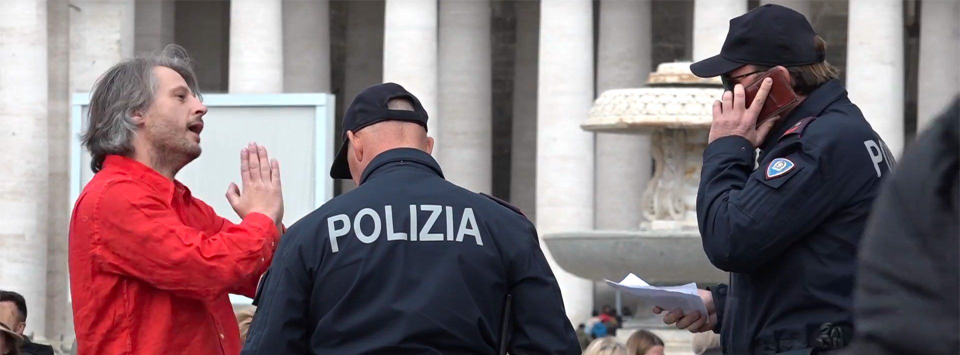 "Santa, Santa", Performance art by Sebastian Bieniek (B1EN1EK), 2017 St. Peter's Square, Vatican City. The artist makes praying and sexual movements at the same time which are opposites while one is holy and the other not.