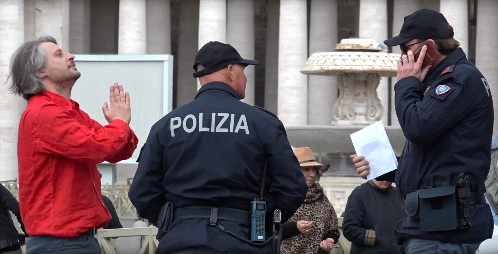 "Santa, Santa", Performance art by Sebastian Bieniek (B1EN1EK), 2017 St. Peter's Square, Vatican City. The artist makes praying and sexual movements at the same time which are opposites while one is holy and the other not.